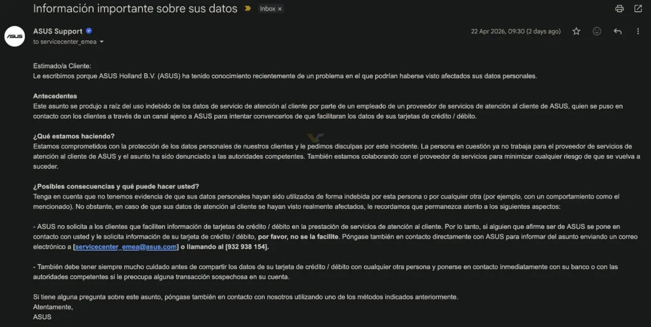 ASUS Holland B.V. poinformował o naruszeniu bezpieczeństwa danych, do którego doszło w wyniku nadużycia uprawnień przez pracownika zewnętrznego dostawcy usług obsługi klienta. Osoba ta, mając legalny dostęp do systemów wsparcia technicznego, postanowiła wykorzystać dane serwisowe do prywatnych celów. Oszust próbował wyłudzać od użytkowników dane kart płatniczych.