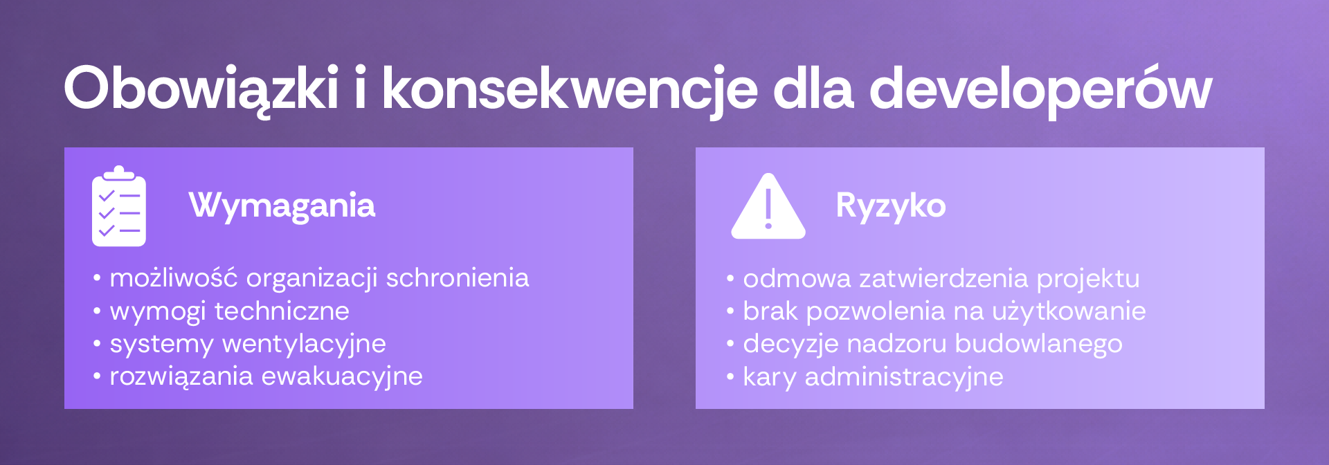 Ustawa z dnia 5 grudnia 2024 r. o ochronie ludności i obronie cywilnej (Dz.U. 2024 poz. 1907 z późn. zm.), podpisana przez Prezydenta RP w dniu 17 grudnia 2024 r., stanowi przełomową regulację w polskim systemie prawnym. Wypełnia ona wieloletnią lukę w zakresie ochrony ludności cywilnej, wprowadzając kompleksowy system planowania, budowania i utrzymywania obiektów zbiorowej ochrony. Choć ustawa w pierwszej kolejności adresuje zadania do organów administracji publicznej, jej przepisy w istotnym zakresie oddziałują także na sektor prywatny, a w szczególności na deweloperów realizujących inwestycje mieszkaniowe i komercyjne. Ustawa nakazuje projektowanie i wznoszenie obiektów zbiorowej ochrony zgodnie z określonymi wymogami techniczno-budowlanymi, w szczególności obejmującymi m.in. wytrzymałość, bezpieczeństwo pożarowe, wentylację, ewakuację oraz zaopatrzenie w energię i wodę.