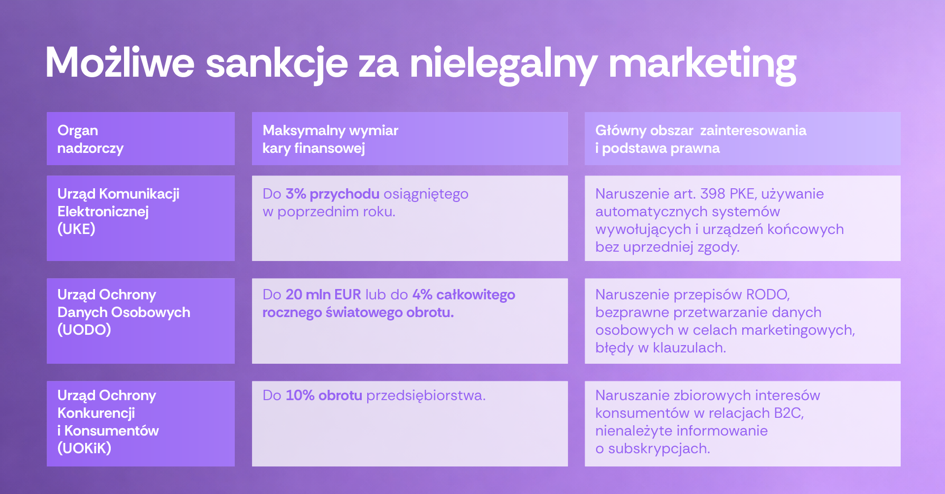 Działalność marketingowa prowadzona z naruszeniem omówionych standardów to nie tylko ryzyko utraty reputacji, ale przede wszystkim realne zagrożenie finansowe. Zbieg przepisów PKE, ogólnego rozporządzenia o ochronie danych (RODO) oraz ustaw o ochronie konkurencji powoduje, iż nielegalna wysyłka ofert aktywuje odpowiedzialność wielopłaszczyznową. Ten sam błąd proceduralny może skutkować wszczęciem postępowań przez trzy niezależne organy administracji publicznej.