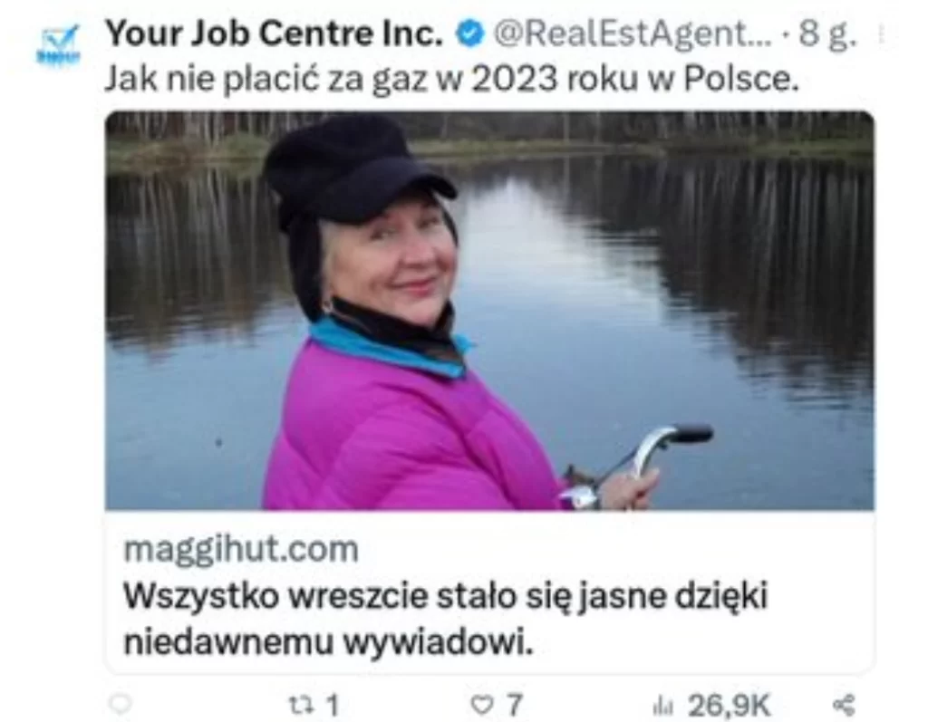 W ostatnich tygodniach co jakiś czas na twitterze pojawia się promowany post, który rzekomo podpowiada jak nie płacić rachunków za gaz w 2023 roku. Zawiera link przekierowujący do podejrzanych adresów stron jak 'maggihut.com’ czy 'shitnation.com’. Sama 'reklama’ zawiera czasami błędy ortograficzne, co samo w sobie jest często sygnłem ostrzegawczym.