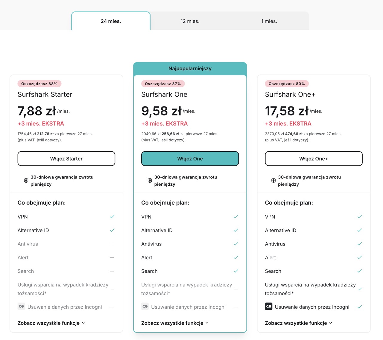Wielu osobom plan Surfshark Starter może wydawać się w pełni wystarczający – nie tylko pozwala ukrywać naszą tożsamość, ale ma też wbudowane liczne dodatkowe narzędzia, w tym pomagające w ochronie naszej prywatności. Warto jednak rzucić okiem na to, jakie profity zyskujemy po zdecydowaniu się na wyższy poziom abonamentu usługi VPN. W przypadku tego dostawcy kolejny plan to Surfshark One za 9,58 zł/mies. (+ 3 mies. dodatkowo).