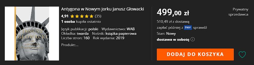 I gdyby przynajmniej połowa z uczniów wybierających język polski jako rozszerzenie kupiła egzemplarz „Antygony w Nowym Jorku”, to moglibyśmy stawiać Głowackiemu pomnik ze szczerego złota. Bo w tej chwili za jedną kopię dramatu przyjdzie nam zapłacić 499 złotych.