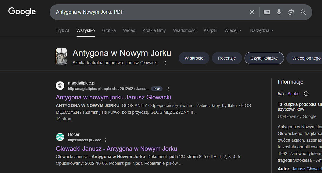 Nie mogę się nadziwić, jak to możliwe, iż w kraju, który chwali się cyfrową szkołą i nowoczesną edukacją, uczniowie muszą szukać lektur jak reliktów z wykopalisk. „Antygona w Nowym Jorku” jest obowiązkowa na maturze, ale jej zdobycie graniczy z cudem. I kiedy młodzi ludzie próbują coś z tym zrobić, ministerstwo wysyła im link do wyszukiwarki Google.