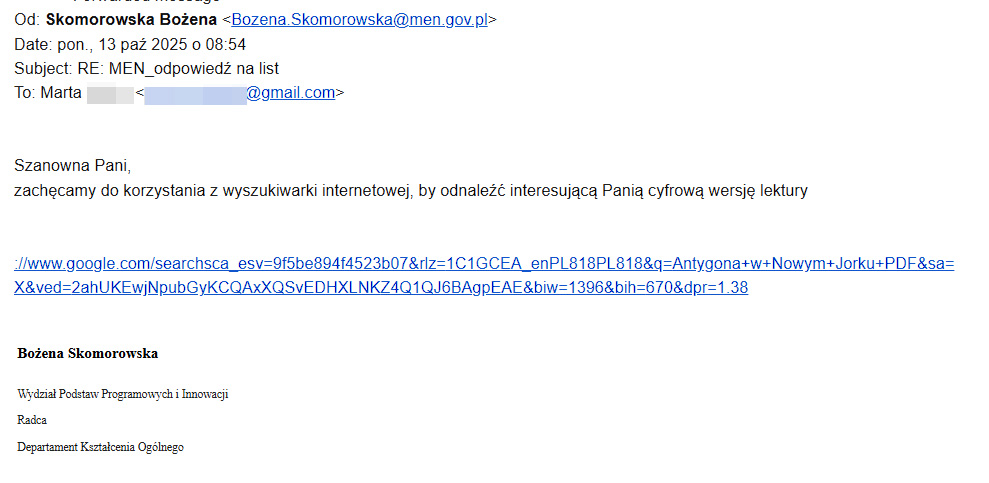 Bo Ministerstwo Edukacji odpisało Marcie linkiem do wyszukiwarki Google