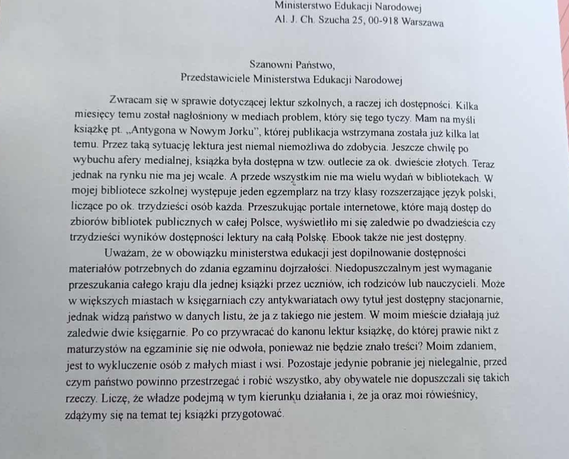 Marta wzięła sprawy w swoje ręce i wystosowała do Ministerstwa Edukacji oficjalny list, opisując problem z dostępnością „Antygony w Nowym Jorku” i prosząc o podjęcie działań, które zmierzałyby ku zmianie kanonu lektur lub po prostu w jakiś sposób wpłynięcia na podaż książki – choćby finansując dodruk i dystrybucję kopii do bibliotek szkolnych. – Gdy moja pani od polskiego na początku roku zaczęła informować całą klasę, iż będzie trudno z tą książką, coś mnie tchnęło i pomyślałam, iż trzeba coś z tym zrobić. Zdecydowałam napisać list – mówiła nastolatka.