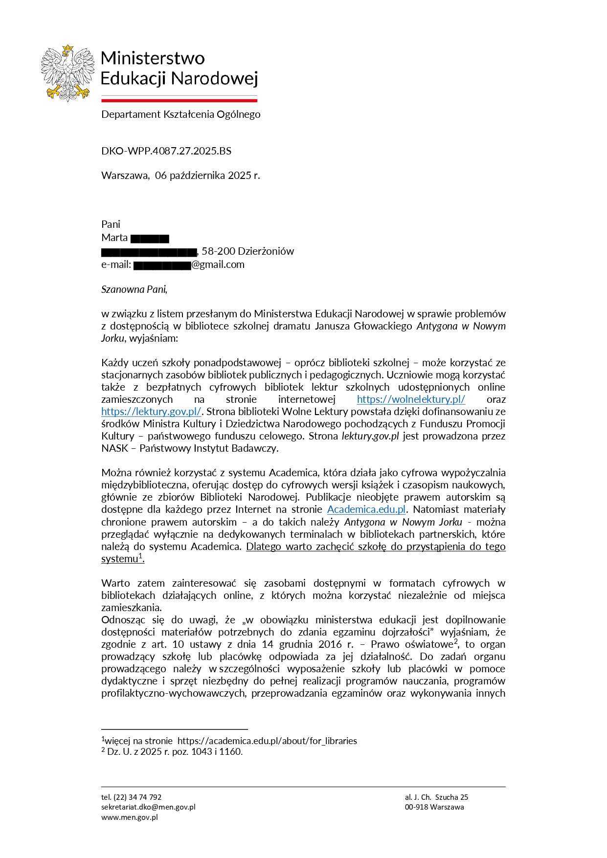 […] Podsumowując, żadna z Pani propozycji nie rozwiązuje mojego problemu. Co więcej, mam pełną świadomość ich istnienia, ponieważ te mają charakter ogólny i szeroko dostępny. Całe moje pismo sprowadza się do jednego: lektura pt. „Antygona w Nowym Jorku” autorstwa Janusza Głowackiego jest w tej chwili praktycznie niedostępna zarówno na rynku księgarskim, jak i w zasobach bibliotecznych, a w tej sytuacji nie pomogą żadne fundusze na jej zakup. Oczekuję podjęcia działań w tej sprawie i dialogu z wydawnictwami, a w szczególności z wydawnictwem W. A. B., które tę książkę wcześniej publikowało […]