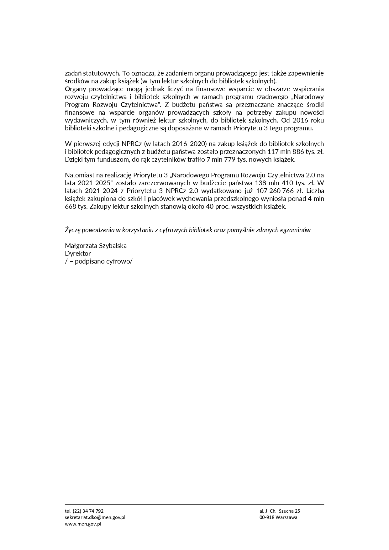 Ministerstwo ponownie nie odniosło się także do treści listu, interpretując go jako prośbę o pomoc w znalezieniu lektury, a nie jako apel o przyjrzenie się popytowi wielokrotnie przewyższającemu możliwości podaży. W ten sposób poważny problem został sprowadzony do roli drobnej uciążliwości – jakby chodziło o brak książki w jednej szkole, a nie w całym kraju. Odpowiedź resortu bardziej przypomina automatyczny komunikat wygenerowany przez bota niż reakcję instytucji, która rozumie wagę własnej roli w systemie edukacji.