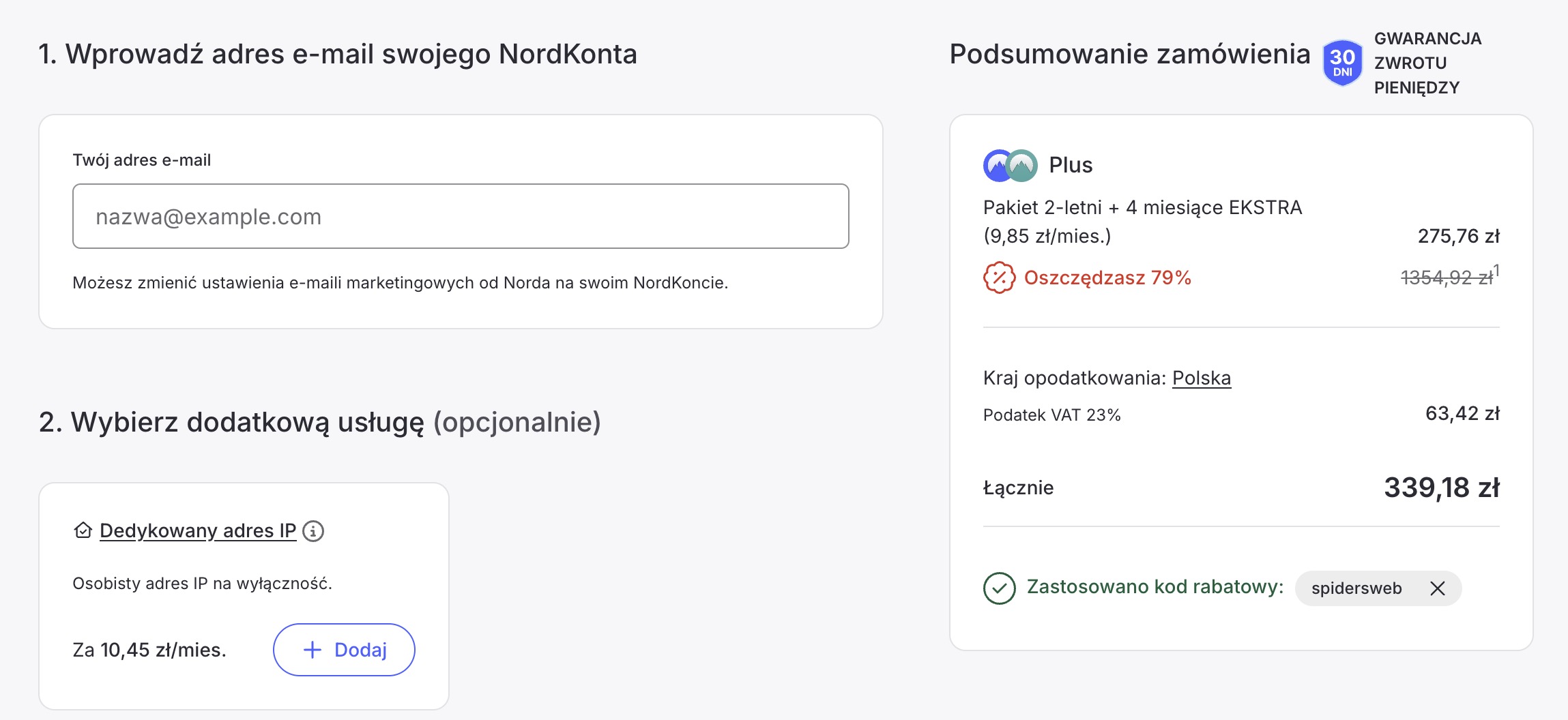 Powyższe stawki dotyczą standardowych pakietów 2-letnich, ale istnieje sprytny sposób, by zyskać aż cztery dodatkowe miesiące subskrypcji zupełnie za darmo. Mianowicie można skorzystać z naszego kodu rabatowego spidersweb. Ten należy wpisać podczas zamawiania konkretnej oferty – w ekranie rozliczenia tuż pod ceną znajdziecie przycisk “Masz kod rabatowy?”. W oknie należy wprowadzić kod, za pomocą którego cena za jeden miesiąc będzie jeszcze niższa.