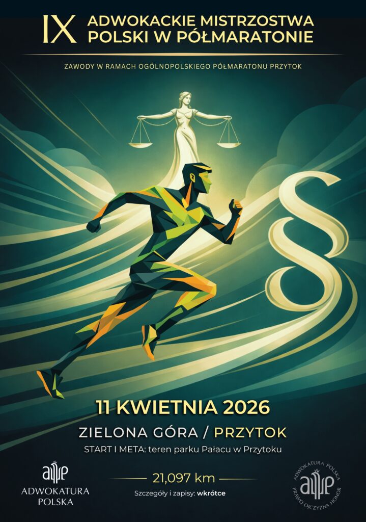 Naczelna Rada Adwokacka wraz z ORA Zielona Góra zapraszają do wzięcia udziału w IX Adwokackich Mistrzostwach Polski w Półmaratonie, które odbędą się w dniu 11 kwietnia 2026 r. (sobota) w Zielonej Górze, a dokładnie w miejscowości Przytok k/Zielonej Góry.